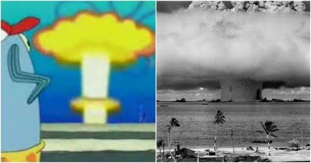- Referensi Budaya Nuklir: Bikini Atol adalah lokasi uji coba nuklir besar-besaran oleh Amerika Serikat. Meskipun SpongeBob SquarePants tidak secara eksplisit menyebutkan dampak nuklir, beberapa teori penggemar menyatakan bahwa Bikini Bottom—sebagai tempat di bawah laut yang dihuni makhluk laut aneh dan unik—mungkin mencerminkan hasil dari paparan radiasi nuklir. Ini adalah spekulasi berdasarkan hubungan historis Bikini Atol dengan uji coba nuklir.